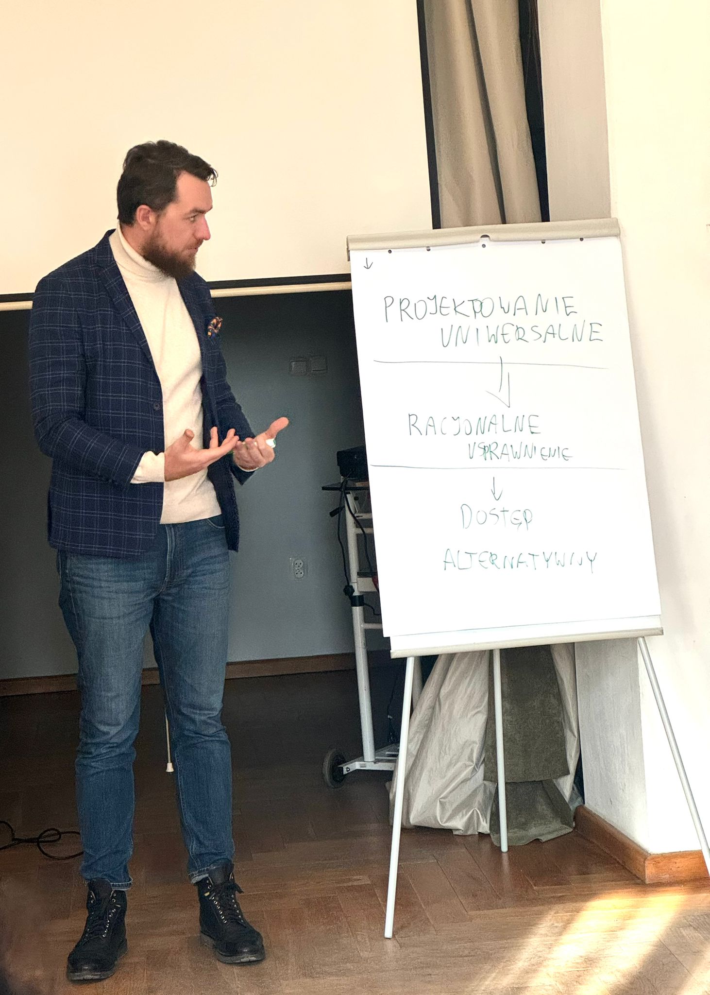 Kolejnym krokiem było poszukiwanie rozwiązań. Uczestnicy z dużym zainteresowaniem poznawali założenia projektowania uniwersalnego, racjonalnych usprawnień oraz dostępu alternatywnego. Zdobyta wiedza stanowiła solidną podstawę do wprowadzania zmian w codziennej praktyce zawodowej.